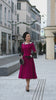 The 1950s was an iconic era for fashion, with the swing style and accessories like scarves playing a significant role. The dress is characterized by its fitted bodice, cinched waist, and a swing skirt that falls just below the knee. Petticoat not included. Scarf is included as on model. On model is fuchsia.