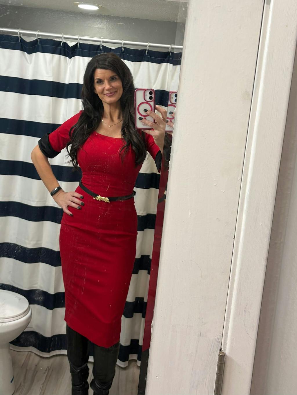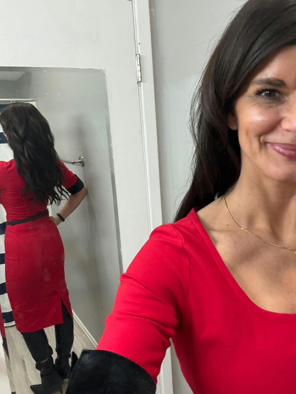 Fabulous red dress (true red, not orange, please refer to bright red swatch) - scoop neckline with black velvet cuffs, pencil shape with slit at back. Effortlessly elegant!