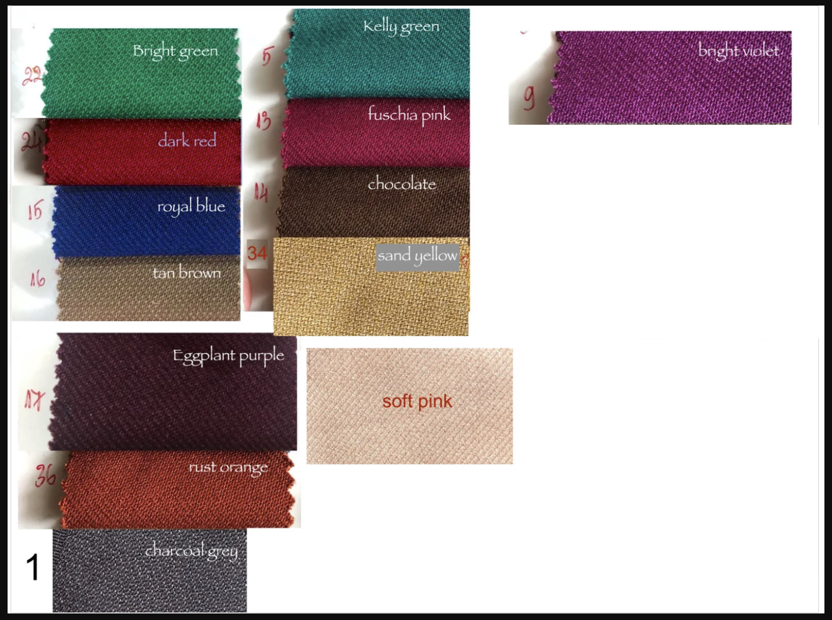 Our handmade pieces come in a variety of colors to suit your meets. When you get Premium Fabric, you have access to even more swatches. Colors include teal and light green, rusty orange, brownish, dark pink, bright purple, and more.