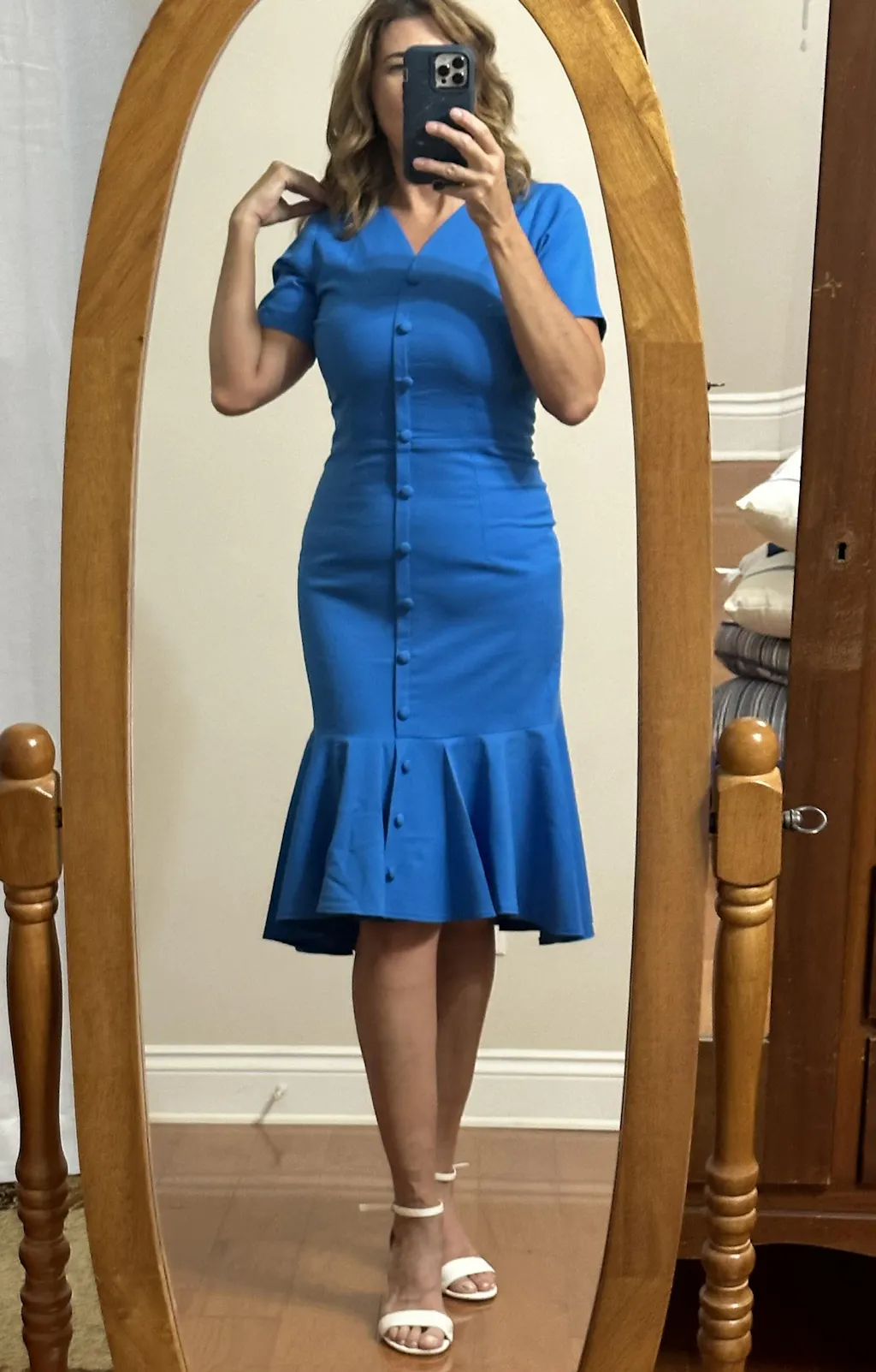 Swish that mermaid tail and look like a 1950s pinup model. This sexy dress is a show-stopper. It accentuates your hour-glass shape with a fitted bodice and slimming waist. The fabric flows sensuously over your hips and flares into a fab mermaid tail with a high ruffle at the back.